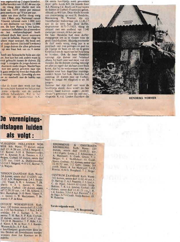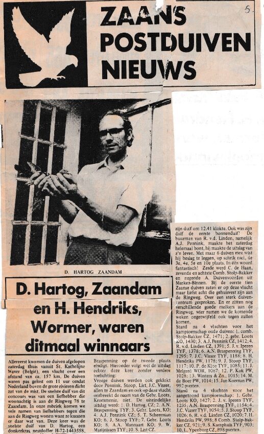 In verband met het overlijden van Dirk Hartog, hij overleed 23 april, brengen we een ode aan een voormalig groot kampioen van de ZCC. Samen met zijn zoon Arie, die helaas op jonge leeftijd is overleden, vormden zij vele jaren een sterk spelend duo. Het hok van waar ze speelden stond aan de Ringweg. Vorige week heeft u al kunnen lezen welke gerenommeerde spelers ook aan de Ringweg hebben gewoond. Fond speler Henk Hendriks kwam uit Wormer, hij won in zijn sterkste jaren de 1e Nationaal van de rampzalige marathon vlucht vanuit München.
