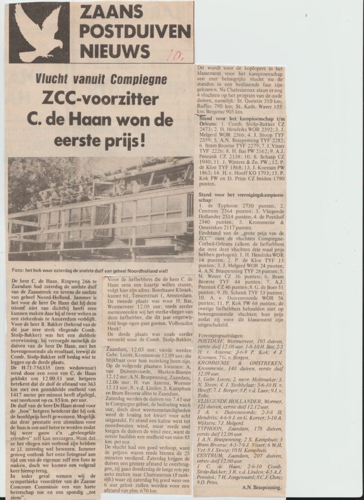 Dit jaar zou de winnende 2-jarige weduwnaar H71-756335 van toenmalig voorzitter Cees de Haan 52 jaar oud geworden zijn. Het bijgevoegde krantenknipsel uit die tijd vermeld het een en ander over de geweldige overwinning voor de toen in het ziekenhuis verblijvende ZCC voorzitter. Waar blijft de tijd? Ik realiseer me dat ik toen pas 36 jaar was. In die tijd waren er in de Zaanstreek een flink aantal melkers van die leeftijd. De duivensport bloeide en groeide in die jaren. Er was toen nog een scheiding tussen verschillende duivenbonden. Hier in de Zaan speelden er een aantal in de NABvP en de anderen in de NBvZ wat inhield dat de NABvP’ers op zondag speelden en de NBvZ’ers op zaterdag. Het is in die tijd een hele heisa geweest om alle bonden in Nederland onder een dak te krijgen. Het is uiteindelijk gelukt en daar heeft niemand spijt van. Vindt u het ook zo raar dat nu er nog maar 4 duivenclubs in de ZCC van de ooit 15 bestaande verenigingen over zijn en dat die leden en besturen elkaar nog niet vinden om met zijn allen onder een dak onze sport te bedrijven? Het is al een halve eeuw geleden dat we er met een aantal melkers mee bezig waren en zelfs een paar aantrekkelijke mogelijkheden niet benut hebben. Duivenmelkers zijn geweldige mensen, ze raken niet uitgesproken over hun fascinerende hobby.…. en toch zijn ze een beetje typisch!