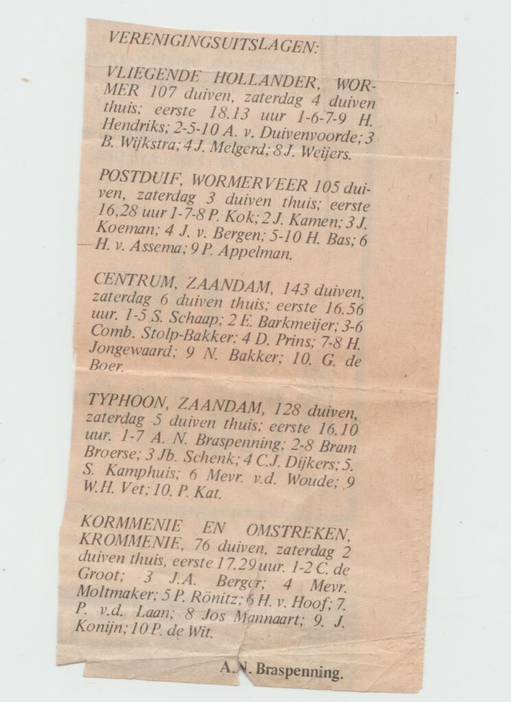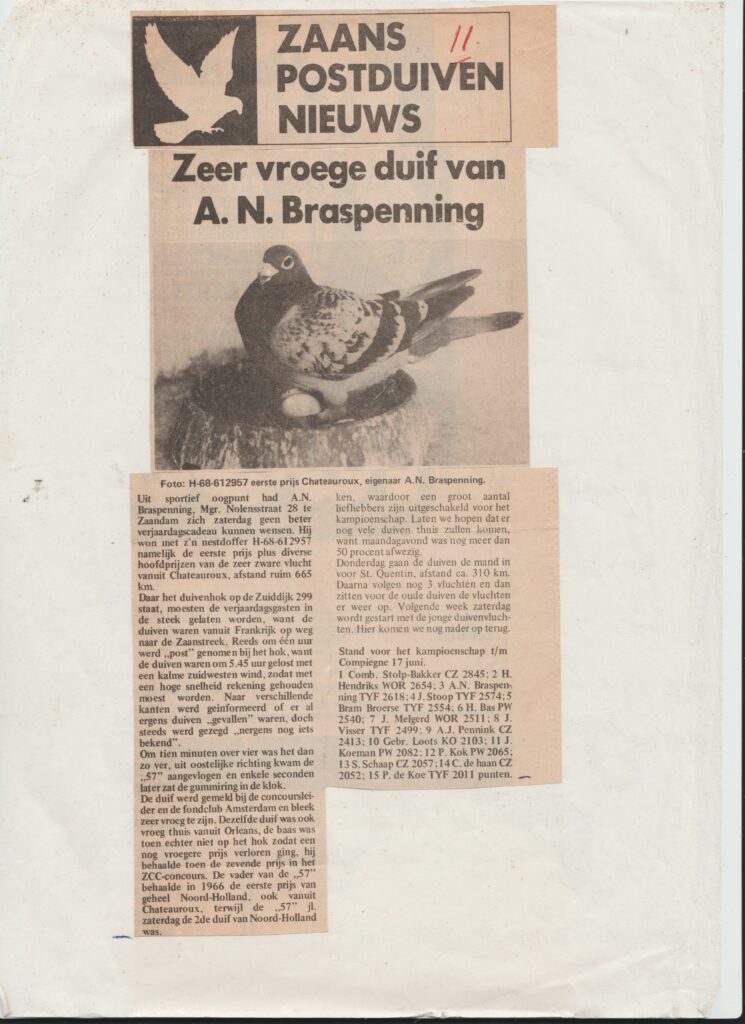 begon Bert Braspenning met de duivensport. Voor zijn 9de verjaardag kreeg hij op 24 juni 1946 zijn eerste twee duiven. Beiden hadden geen achterteen meer en waren ongeringd. Oorzaak WO-2. In 1948 werd hij lid van de jeugd afdeling van Bevrijde Vleugels (NBvZ). Het inkorflokaal was de schuur van ZCC (NABvP) penningmeester Cees Molenaar die een groentezaak had aan het toenmalige Otterspad (later Klokbaai) vlakbij de Bullekerk in Zaandam. Bij het inkorven moest de jeugd in de steeg naast het lokaal wachten tot zij aan de beurt waren. De jeugd mocht toen maar 1 duif klokken. De senior leden mochten wel in het gerieflijke(?) lokaal. Als 13 jarige won hij het provinciaal jeugd concours en zijn duif was ook de snelste van alle senioren. Ruim 25 jaar later, op Bert zijn verjaardag, won zijn nestdoffer de “957” de eerste in de ZCC en werd als tweede afgevlagd over heel Noord-Holland en daar gaat bijgaand krantenknipsel over.