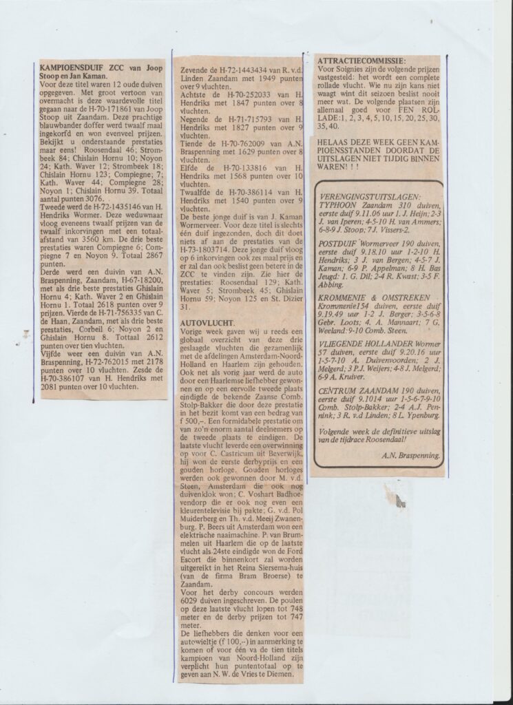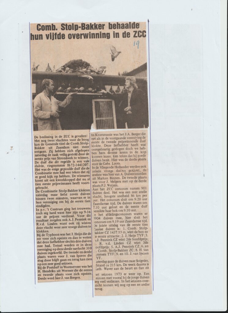 Comb. Stolp-Bakker won met nog twee vluchten te gaan voor de 5e keer de eerste prijs in de ZCC. Hierdoor stelde zij de generale titel toen al veilig. Jaap Stolp en Bert Bakker speelden in combinatie. Hun hok stond aan de Ringweg op het terrein van hondenpension Lagerweij vlak naast het erf van ZCC voorzitter Cees de Haan. Bert woonde aan de Ringweg en Jaap in een flat in de wijk Poelenburg. Later verhuisde Jaap naar de voormalige woning van Bram Broerse aan het Haaldersbroek waar hij alleen verder ging. Bert Bakker ken ik nog uit de tijd dat hij met zijn broer samen speelde ik dacht in de Schoolmeesterstraat te Zaandam. Nicolaas Bakker (BVZ) heeft het stokje van vader Bert overgenomen. Toen Bert overleed was hij samen met zijn zoon lid van BVZ. Daarvoor waren beide lid van PV Het Centrum die het verenigingslokaal aan de Ringweg hadden. De Comb. Stolp-Bakker was in die jaren het niet te kloppen duo. Niet alleen in de ZCC speelde ze rats aan de kop ook in de toenmalige Kring-2 met ruim 1000 leden waren ze enkele jaren niet te kloppen. Hun kolonie bestond voornamelijk uit duiven van Jan Loots en van Albert van der Flaes uit het Belgische Ravels. Veel leesplezier in bijgaand uitgebreide krantenverslag.