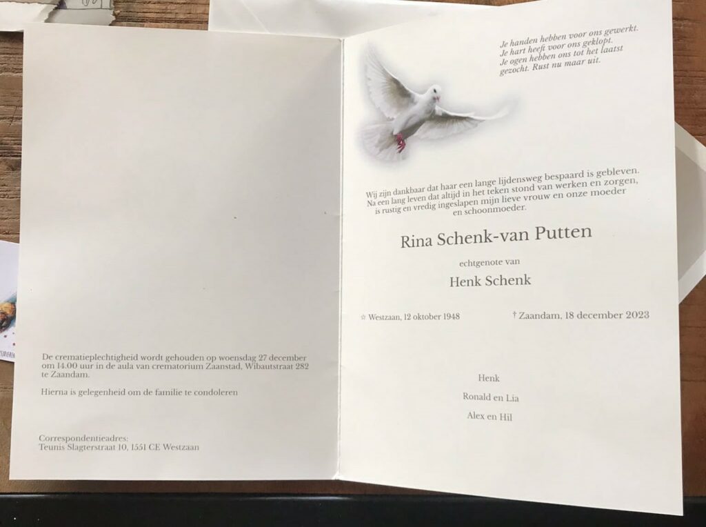 Via een overlijdenbericht in het Noord-Hollands dagblad bereikte ons het droeve bericht dat ons aller RINA SCHENK vrij plotseling is overleden. Rina is de echtgenote van Henk Schenk en de moeder van twee zonen.